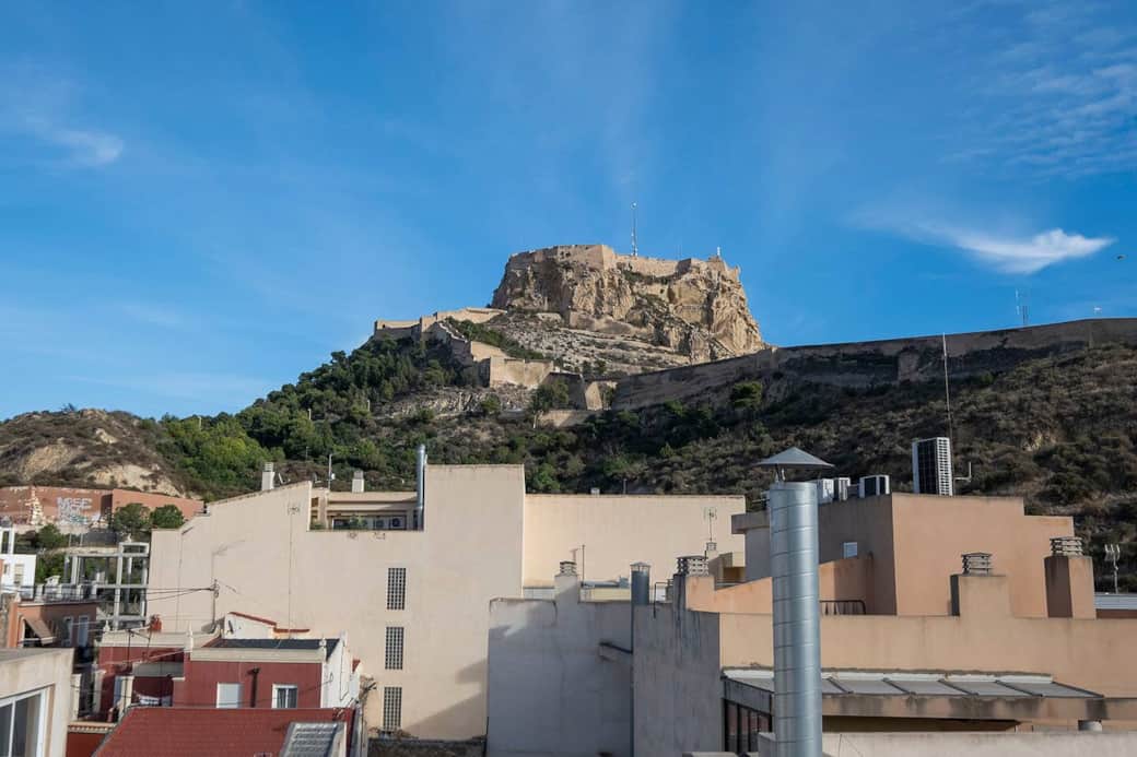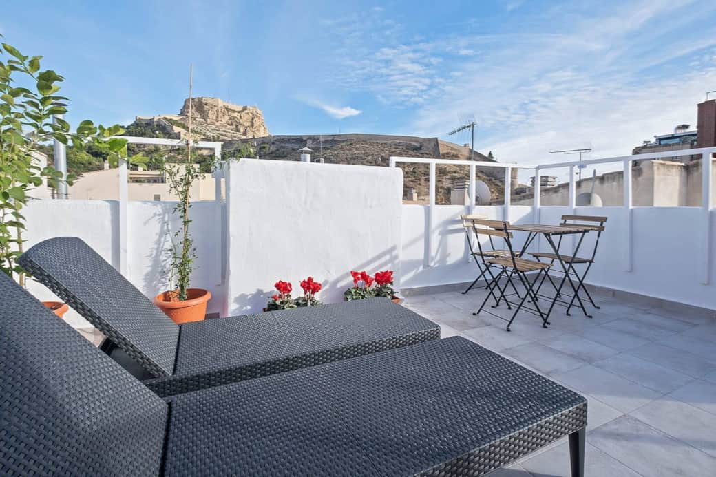 El gran protagonista de este estudio es su terraza propia, con vistas privilegiadas al Castillo de Santa Bárbara y al mar Mediterráneo.